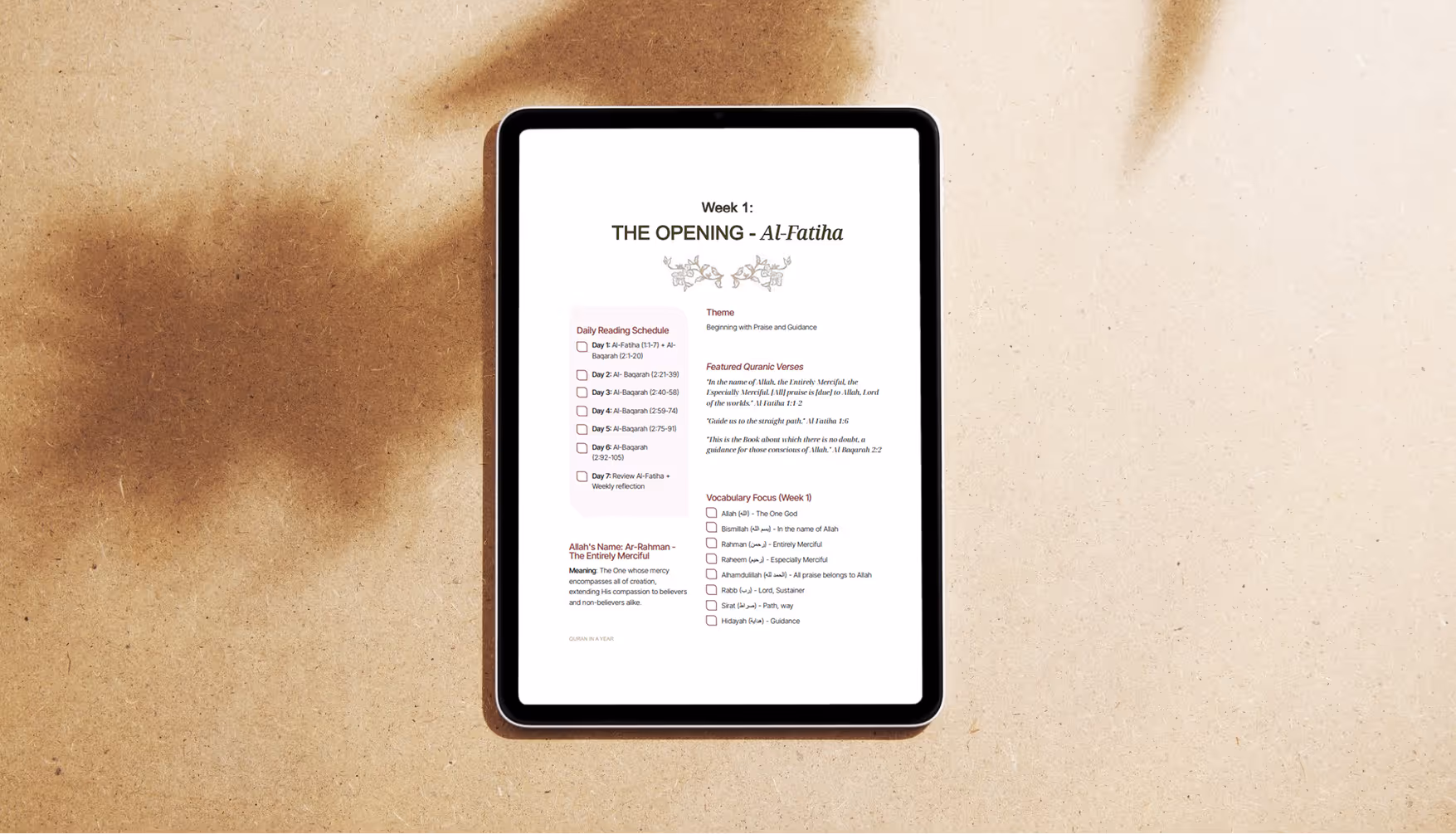 A structured, 52-week guided roadmap to deepen your relationship with Allah’s final revelation. Daily readings, Arabic vocabulary, and spiritual themes—all in one accessible PDF.